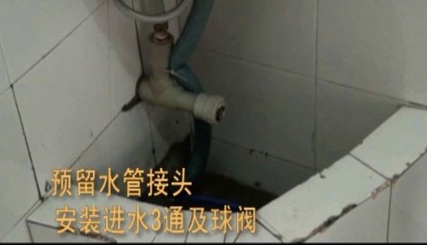2.預留水管接頭,安裝進水三通及球閥,進水球閥纏生料帶16-18圈,將纏好的進水球閥接入進水三通,用扳手擰緊接頭,再將進水三通纏生料帶11-13圈,將進水三通和球閥裝在預留水管接頭處,并用扳手擰緊固定。