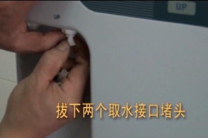 5.拿下水箱頂部藍色蓋帽,在螺紋處纏生料帶5圈,旋入桶球閥,用手直接擰緊,注意不要用力過大。將已經接入水箱接口的白色PE管的另一端插入水箱頂部的桶球閥,然后嵌入卡環 。