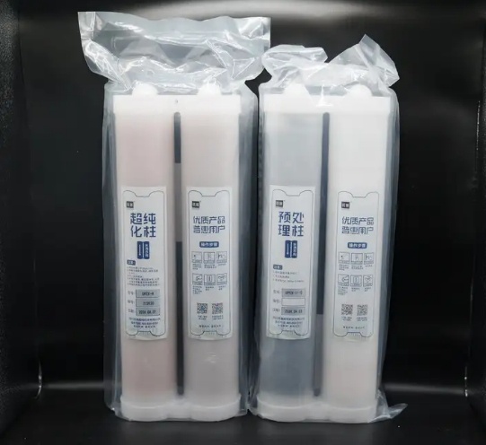 (1)離子交換純化柱:由陰離子交換樹脂和陽離子交換樹脂按比例混合而成。陽離子交換樹脂用其H+交換去除水中的陽離子,陰離子交換樹脂用其OH-交換去除水中的陰離子,在混床樹脂中被交換出來的H+和OH-結(jié)合生成H2O,因此混床離子交換純化柱可用來深度去除RO純水中尚存的微量離子。小型實(shí)驗(yàn)室超純水機(jī)中的混床離子交換純化柱通常為一次性使用。